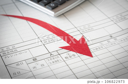 家計簿と下降矢印 家計管理 収支 減少