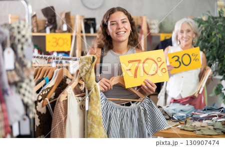 Two positive women holding sale banner in clothing store
