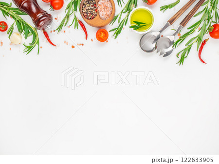fresh herbs, spices and kitchen utensils on a white background. Cooking table. top view. copy space