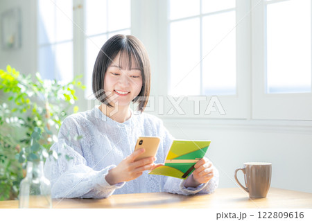 通帳とスマホを見る女性