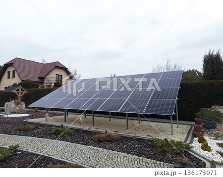 Ground mounted solar panels on landscaped residential land