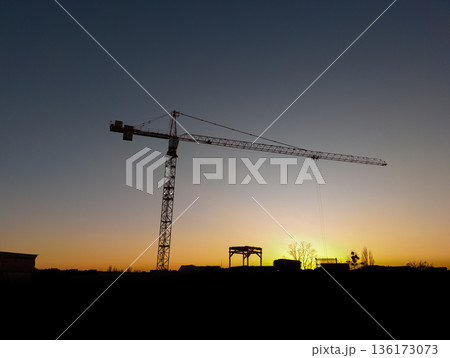 Construction crane silhouette at sunset over urban skyline