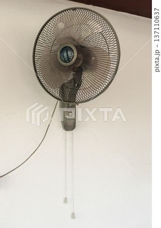 Wall mounted electric fan with pull cords on white wall providing ventilation and cooling in tropical house interior