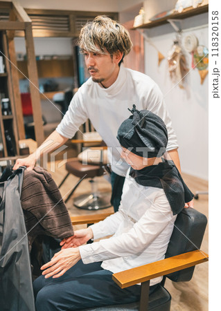 ブランケットを取り、椅子を回転してシャンプー台にお客様を誘導する美容師
