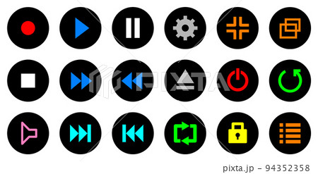 音楽や動画のプレーヤーを操作する丸形ボタンのアイコンセット