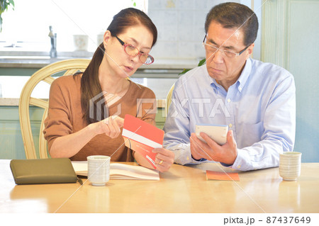 通帳を手にする妻、電卓をたたく夫、家計のやり繰を相談する年金受給のシニア夫婦