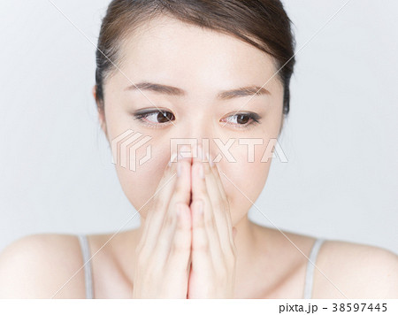 若い20代女性の洗顔などの朝のビューティーイメージ 口元や肌を気にする