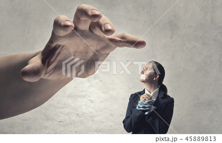 Two hands covering mas mouth to impose ban on dissemination of information through censorship