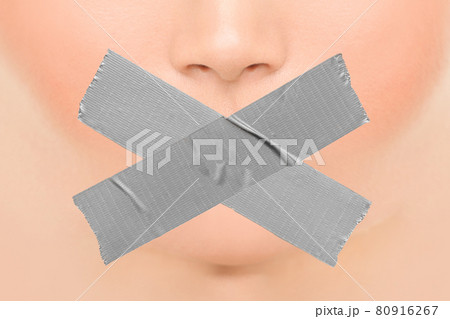 Woman silenced with adhesive duct tape covering closed mouth. Censorship, shut down of freedom of speech. Face nose and lips