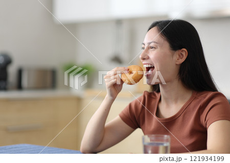 何かを嬉しそうに頬張るぽっちゃりした女性 口を開く