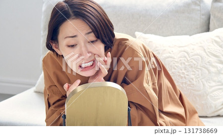 口腔内のトラブルイメージ 鏡を見て顔をしかめるシニア女性
