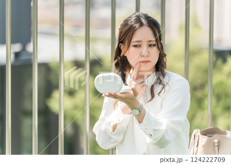 休憩時に化粧直し・メイク直しをする女性・ビジネスウーマン(口紅・リップ・ルージュ・グロス・唇・唇)