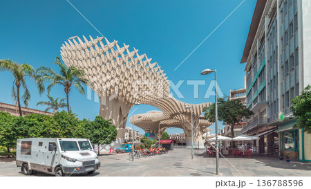 Metropol Parasol in Encarnacion Square timelapse hyperlapse, modern wooden structure, Seville