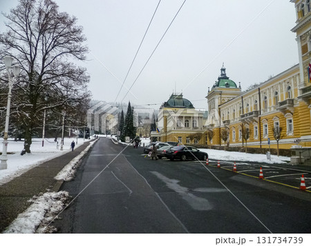 Marianske Lazne, Marienbad, Czech Republic - February 2, 2014: Snow-covered hotel buildings of the spa town in the western part of the Czech Republic.