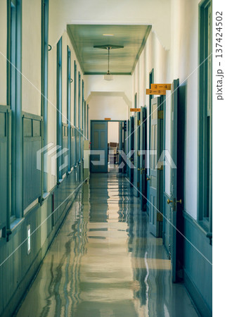 旧朝日小学校のレトロ感漂う教室の窓辺と廊下【茨城県石岡市】