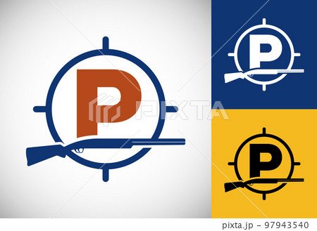 Initial alphabet P with gun and target sign. Inspiration hunting club logo vector. Hunting logo
