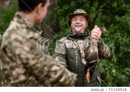 Happy Hunter Man Shows Fetched Wild Duck to Son.