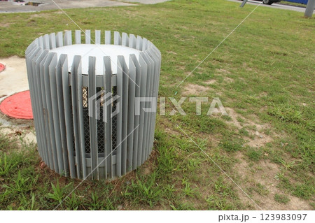 The ventilation shaft sticks out of the ground and is covered with a decorative box
