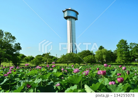 行田市古代ハスの里の展望タワーと花咲くハス池