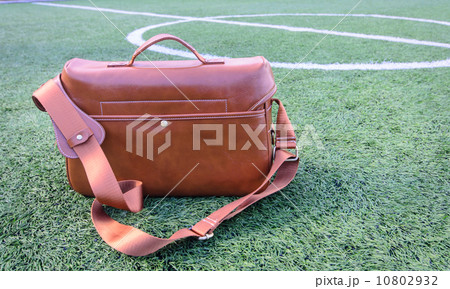 Vintage leather bag on green grass