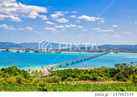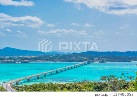 沖縄県国頭郡今帰仁村/名護市 沖縄本島方面と古宇利島を結ぶ古宇利大橋から眺める古宇利ブルーの海