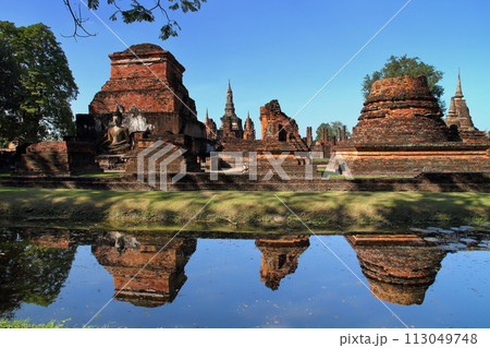 タイ北部の古都スコータイ 世界文化遺産スコータイ歴史公園のワットプラパーイルアン遺跡と池の水鏡