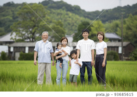 夏休み 故郷に帰省した三世代家族の集合写真 田舎のあぜ道で撮影