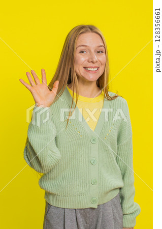 Happy woman smiling friendly waving hands gesturing hello greeting or goodbye, meeting invitation