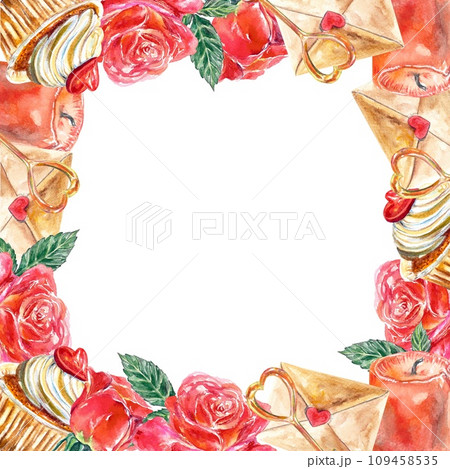 Square frame with roses, candles, envelopes, cakes. Watercolor illustration isolated on white background. Valentines Day cards, wedding invitations.