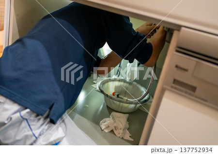 a housewife cleans up spilled water during a breakdown of a household washing machine