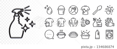 Cleanser spray, Wash hands and Shampoo line icons for web app. Glare of light effect. Message icon. Pack of Saucepan, Bucket, Wash hand pictogram icons. Vector