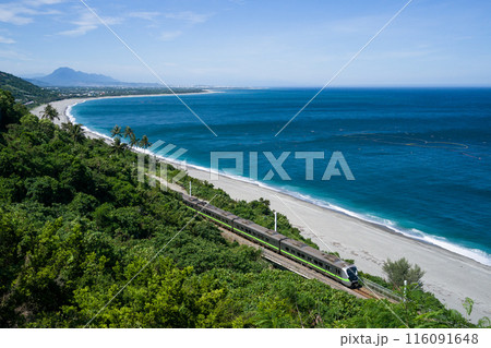 台湾鉄路管理局EMU3000型電車「自強号」が海を背景に絶景の南廻線の太麻里を走る