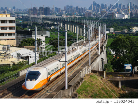 市街地を背景にカーブを曲がり走る台湾新幹線(台灣高鐵)