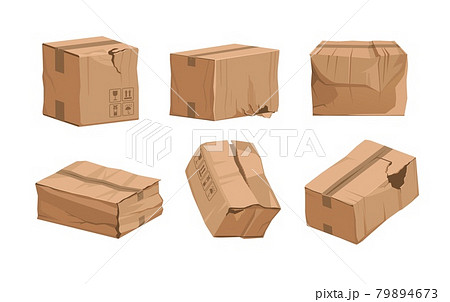 Damaged box. Cartoon broken package. Ripped and wet shipping cardboard packaging. Cargo and mail parcels set. Wrinkled containers. Vector poor quality delivery or warehouse storage