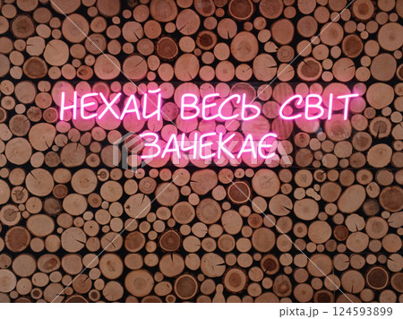 Bright neon signage on artistic wood background promoting creativity and rustic design