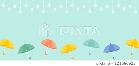 雨と傘のベクターイラスト背景素材 梅雨 パラソル コピースペース フレーム 枠 水色 カラフル 6月