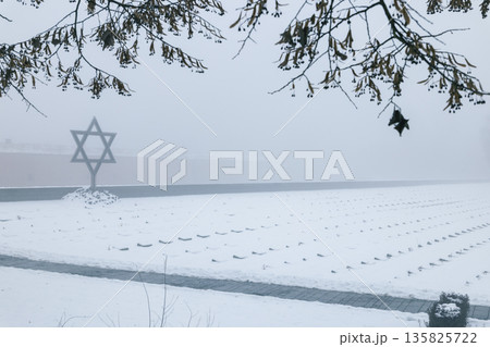 Star of David monument in winter snow, Terezin