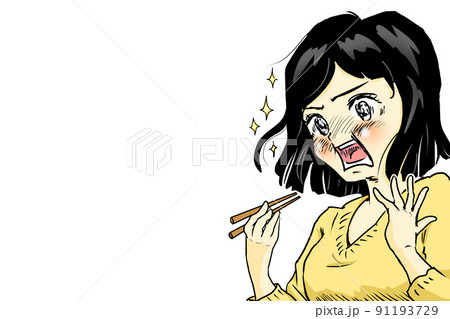 食べて「うっまぁぁぁぁぁぁぁーーっ」と叫ぶ女性の漫画風イラスト(カラーバージョン)