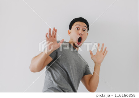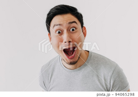 Wow and surprised face of man in grey t-shirt isolated on white background.