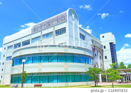 岐阜県各務原市、各務原市立中央図書館と噴水の風景