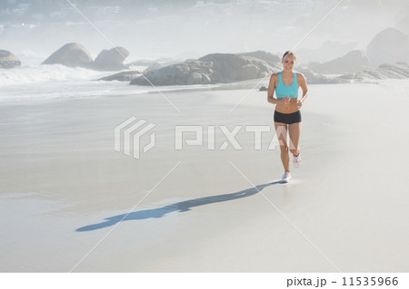 Fit woman smiling and jogging on the beach