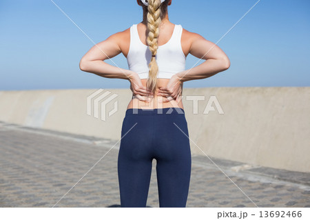 Fit blonde touching her back on the pier