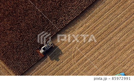 Aerial drone top view Big powerful industrial combine harvester machine reaping golden ripe wheat cereal field on bright summer or autumn day. Agricultural yellow field machinery landscape background