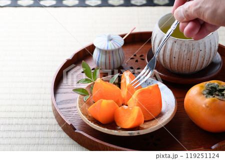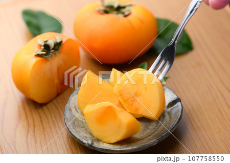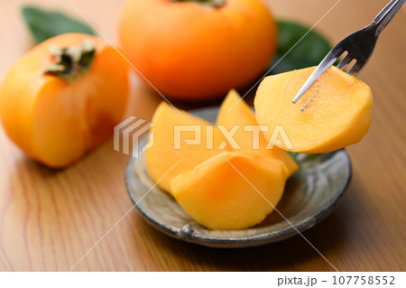 とっても甘い秋の味覚 皿に盛り付けた 柿をフォークでつまむ フルーツ (テーブルバック)柿の実 かき