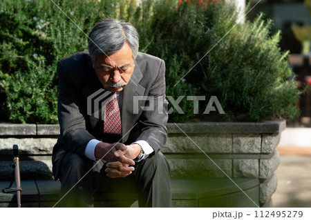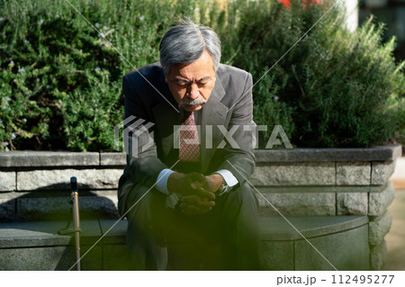 シニア男性 スーツ 座る 悩む