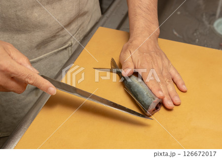 男性が魚のアジをさばいている素材写真 背中から包丁を入れようとしている