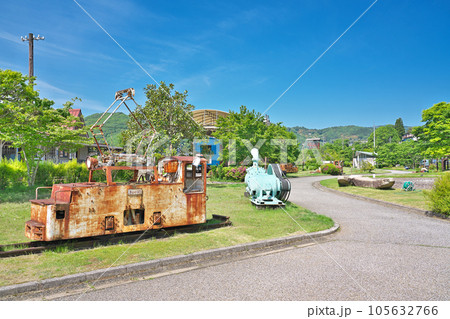 柵原ふれあい鉱山公園の鉱山資料館と車両と周りの景色を撮影