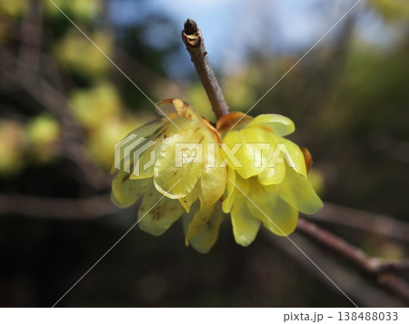 冬の枝に吊り下がるように開花した黄色いロウバイ(蝋梅)の花