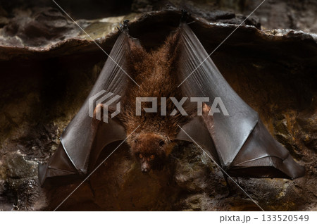 羽根を広げるオリイオオコウモリ