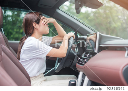 woman feeling stress and angry during drive car long time. Asian girl tired and fatigue having headache stop after driving car in traffic jam. Sleepy, stretching and drunk concept